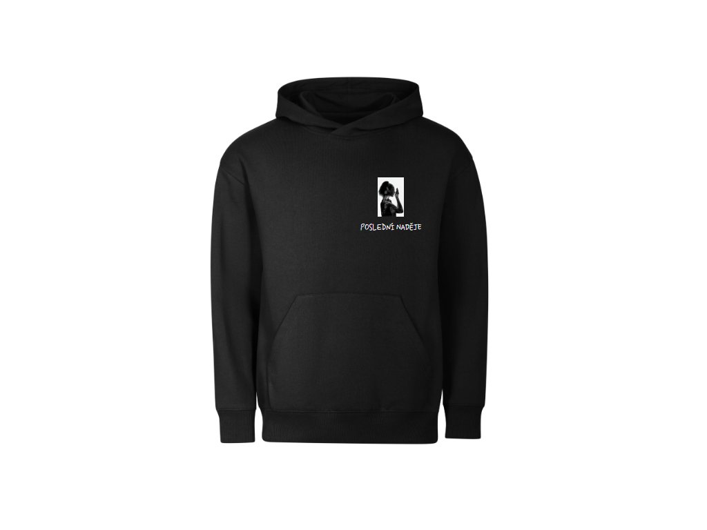 Na zadní straně mikiny najdete výrazné heslo: „Postav se a řekni STOP násilí“, které se stalo symbolem odvahy, síly a neústupnosti proti útlaku. Přední strana je zdobena minimalistickým designem, který připomíná příběh knihy „Poslední naděje“ – odraz naděje ve chvílích nejistoty.